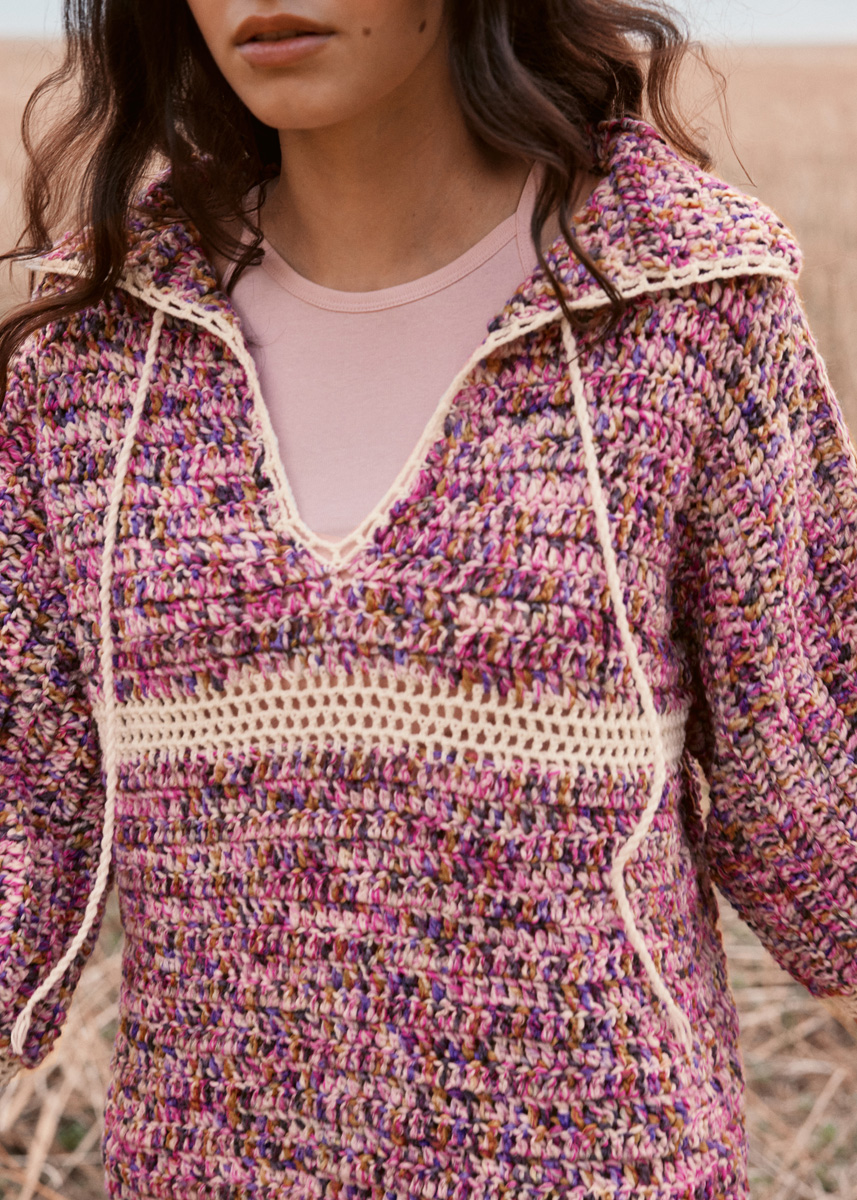 Lana Grossa Colortwist (74% ren ny ull (merino), 20% bomull, 6% polyamid, löplängd 90 m/50 g), 500 (550 – 600) g råvit/pink/ljus grå/Senfgul/Grå/Lila (färg 12) och Lana Grossa Cashmere 16 Fine (80% ren ny ull (merino), 10% kashmir, 10% polyamid, löplängd 320 m/50 g), 50 g råvit (färg 9); 1 virknål nr. 4 och 6.