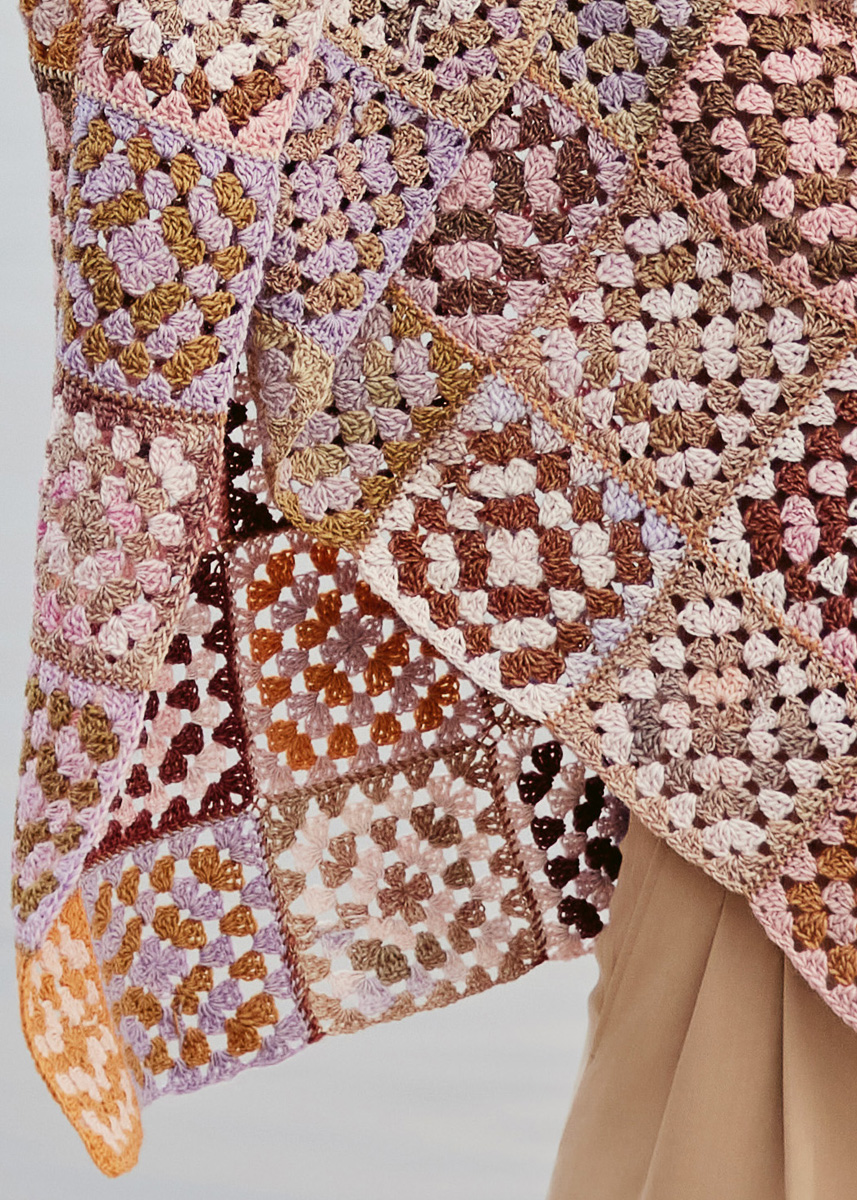 Lana Grossa-kvalitet „Gomitolo Aida“ (60 % ren ny ull, 40 % polyacryl, löplängd = ca 700 m/200 g): 400 g gammelrosa/beige/mjukrosa/orange/syren/kamel/rosa (färg 261) och 400 g gråbrun/burgund/beige/taupe/kamel/oliv/guldgul/karamell (färg 268); virknål nr. 4; stickor nr. 4.