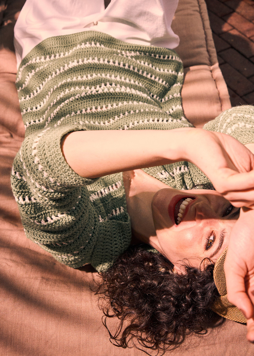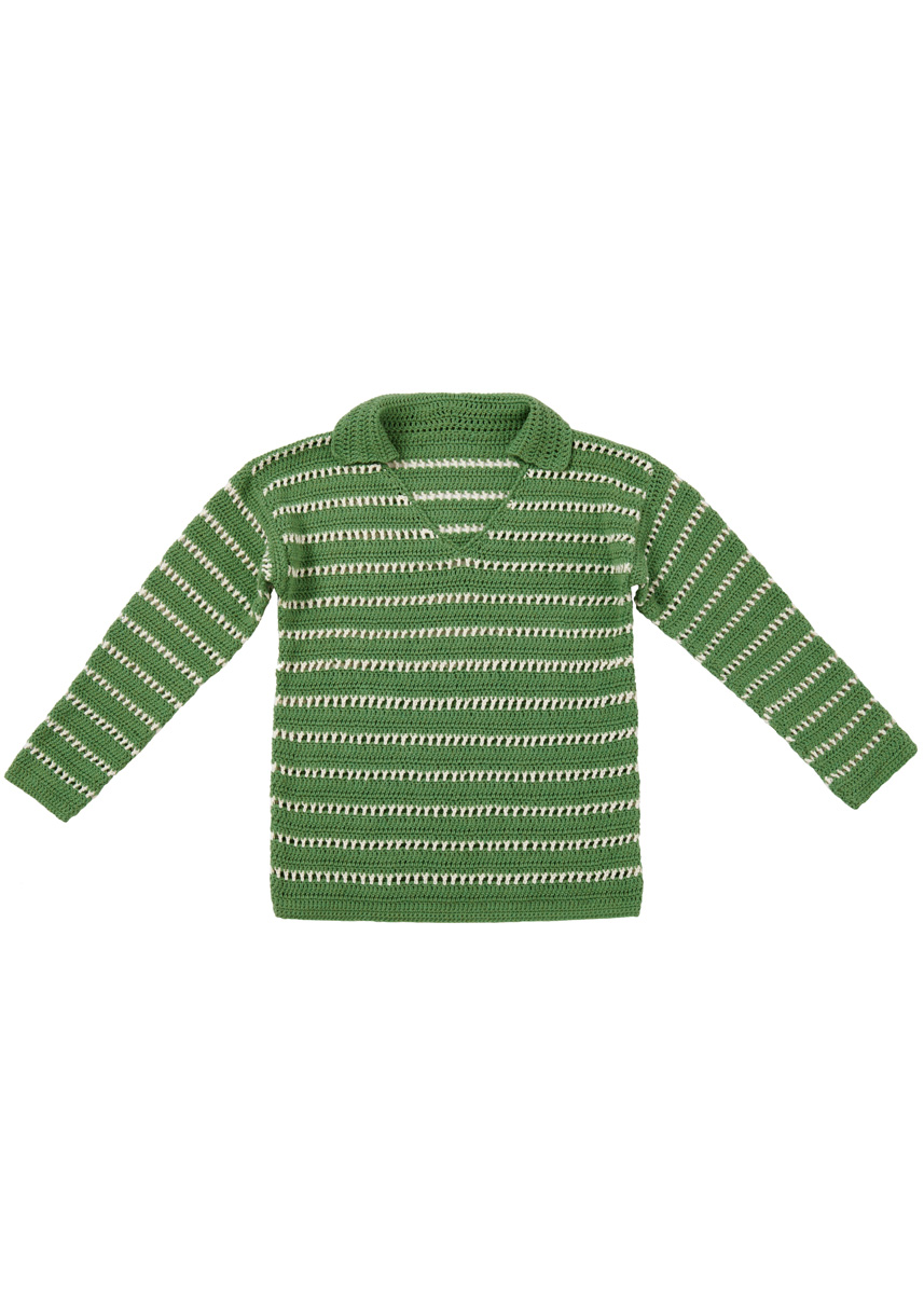 Lana Grossa-kvalitet „Brigitte No. 4“ (80 % bomull, 20 % baby alpacka, löplängd 110 m/50 g): 500 (550/600/650) g i grön nr. 12 och 100 (150/150/150) g i creme nr. 1. Virknål 3,5 (löst virkat) eller 4 (hårt virkat) – viktigt är att virkfastheten passar.