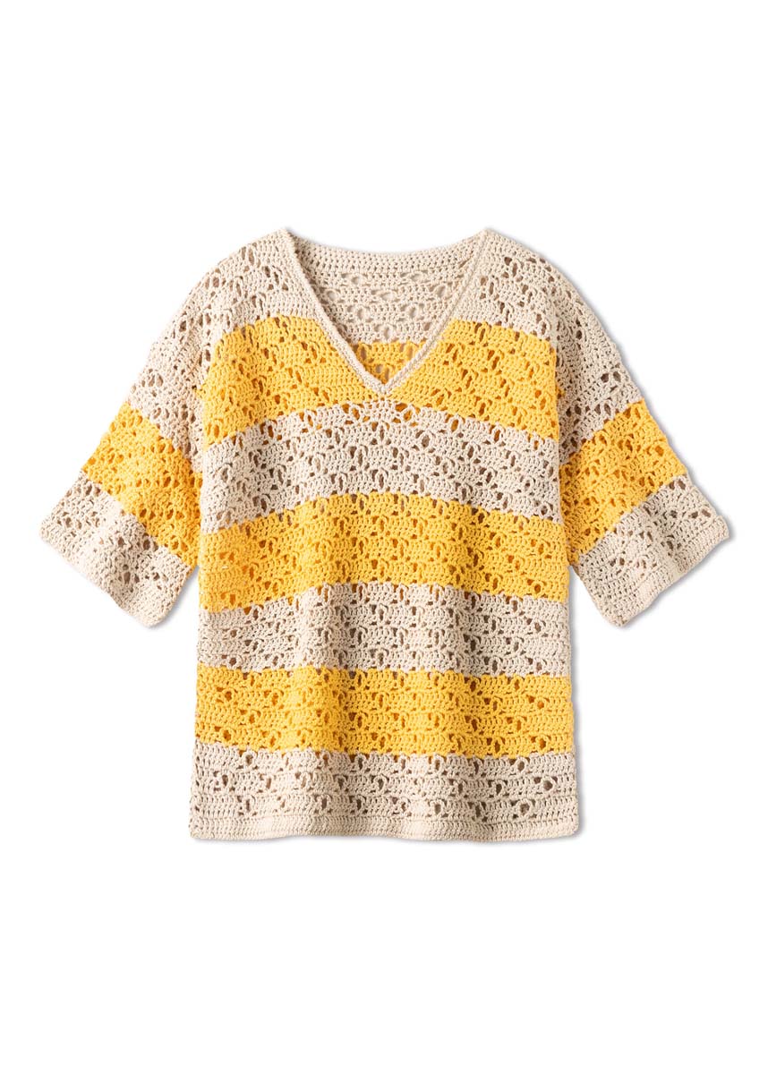 Lana Grossa-kvalitet „Landlust Baumwolle” (100 % (bio) bomull, løpelengde = ca. 115 m/50 g): ca. 250 (300) g natur (farge 3) og ca. 150 (200) g gul (farge 5); heklenål nr. 4 og 4,5.
