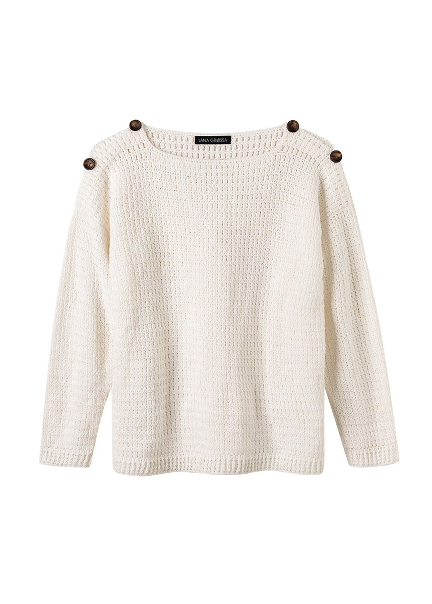 Lana Grossa-kvalitet ”Linissimo” (50 % hør, 50 % bomuld, løbelængde = ca. 187 m / 50 gr): ca. 550 (600 – 650) gr hvid (fv 1), hæklenål nr. 3, 4 hornknapper, mørkebrun meleret, 20 mm Ø.