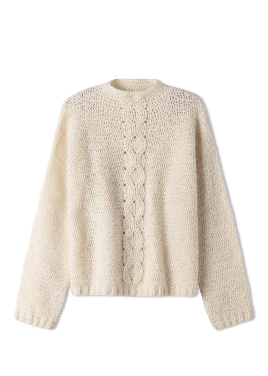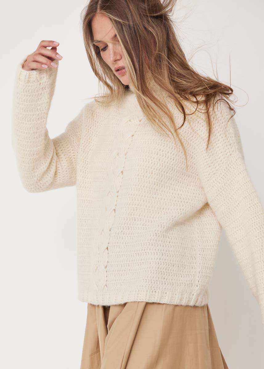 Lana Grossa Nebbia (55% % ny ull (merino ekstrafin), 45% (baby) alpakka, løpelengde = ca. 170 m/50 g), 400 (450 - 500 - 550) g i råhvit (farge 15); heklenål nr. 3,5 og nr. 4,5.