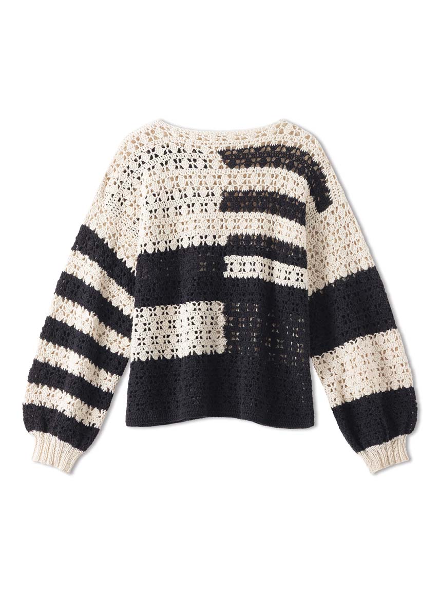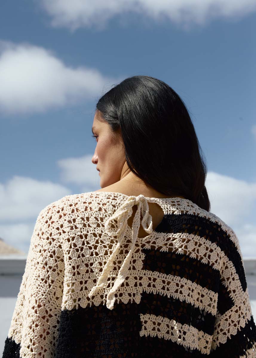 Lana Grossa-kvalitet „Setapura” (100 % silke, løpelengde = ca. 200 m/50 g): ca. 250 (300 – 350) g hver i creme (farge 15) og svart (farge 16); 1 heklenål nr. 3,5, strikkepinner nr. 3.
