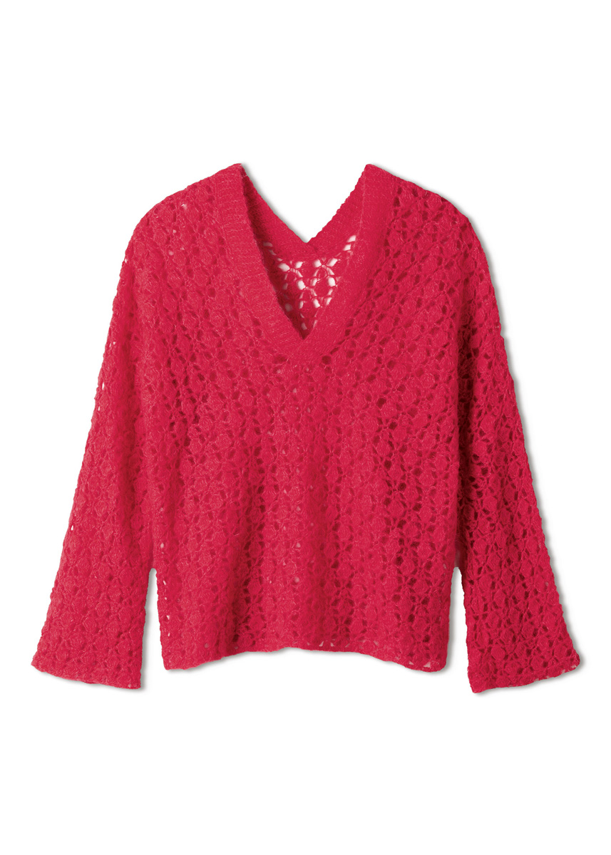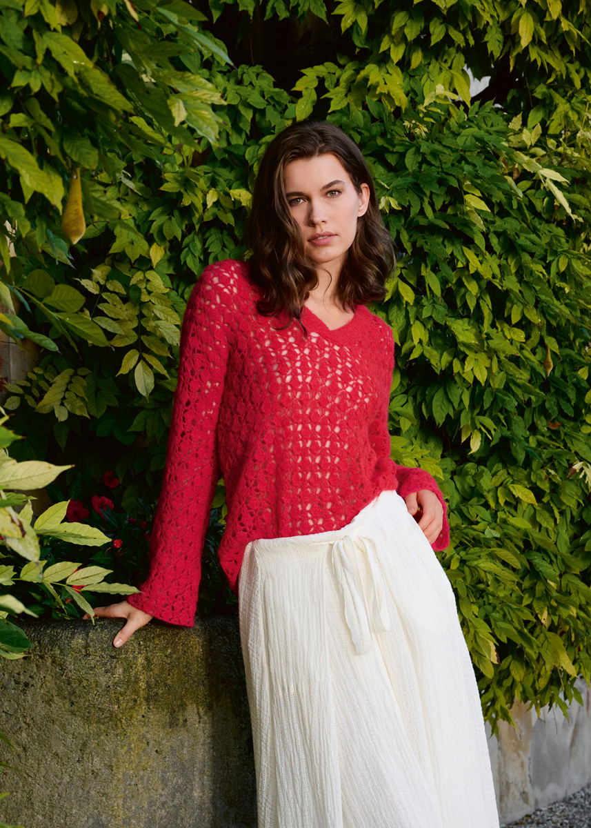 Garn: Lana Grossa «Setasuri» (69 % alpakka (suri), 31 % silke, LL = ca. 212 m/25 g): Ca. 175 (200 - 225) g bringebær (frg 68) Heklenål: Nr. 3,5 og 4