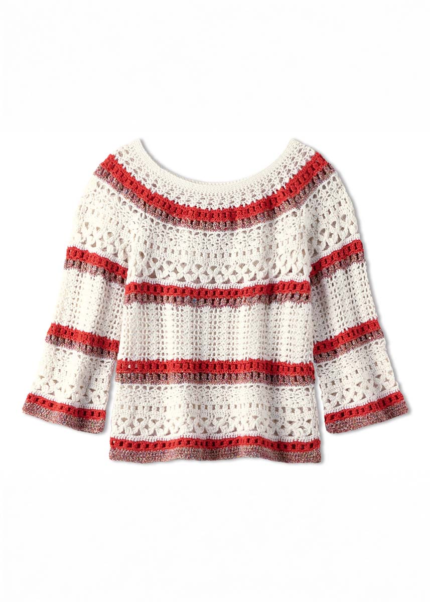 Lana Grossa-kvalitet „Summer Cashmere” (90 % bomull, 10 % kasjmir , løpelengde = ca. 210 m/50 g): ca. 200 (250) g hvit (farge 1) og ca. 100 (150) g lyserød (farge 5) og Lana Grossa-kvalitet „Maglia” (92 % bomull, 8 % polyester, løpelengde = ca. 155 m/50 g): ca. 100 (150) g råhvit/rød/oransje/blå/lysegrønn (farge 3);1 heklenål nr. 3,5.