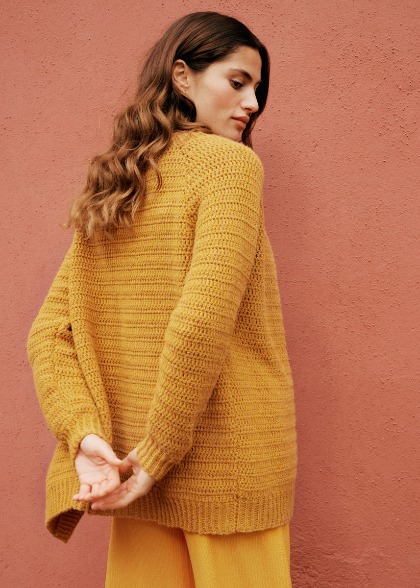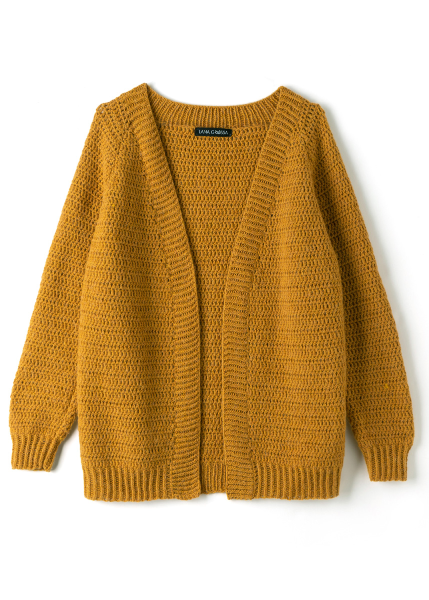 Lana Grossa-kvalitet „Ecopuno” (72 % bomull, 17 % ren ny ull (merino), 11 % (baby) alpacka, löplängd = ca. 215 m/50 g): ca. 600 (650 – 700) g gulorange (färg 33); stickor nr. 4,5, 1 rundsticka nr. 4,5, 120 cm lång, 1 virknål nr. 5. Modellen stickas och virkas med dubbla trådar!