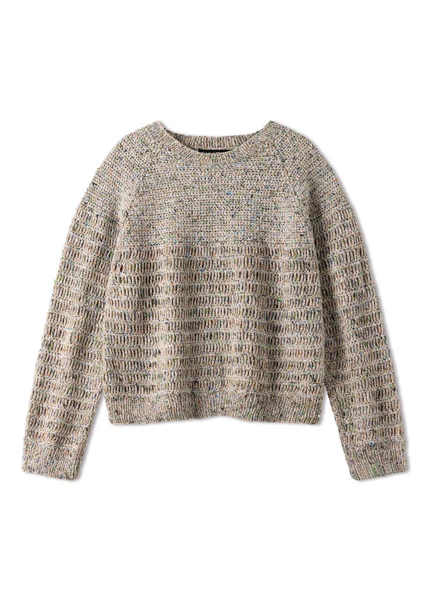 Lana Grossa-kvalitet „Maglia” (92 % bomull, 8 % polyester, løpelengde = ca. 155 m/50 g): ca. 400 (450 – 500) g råhvit/guldgul/anthrasitt/blå/grønn (farge 8); 1 heklenål nr. 4, strikkepinner nr. 3, 1 rundpinne nr. 3, 50 cm lang.