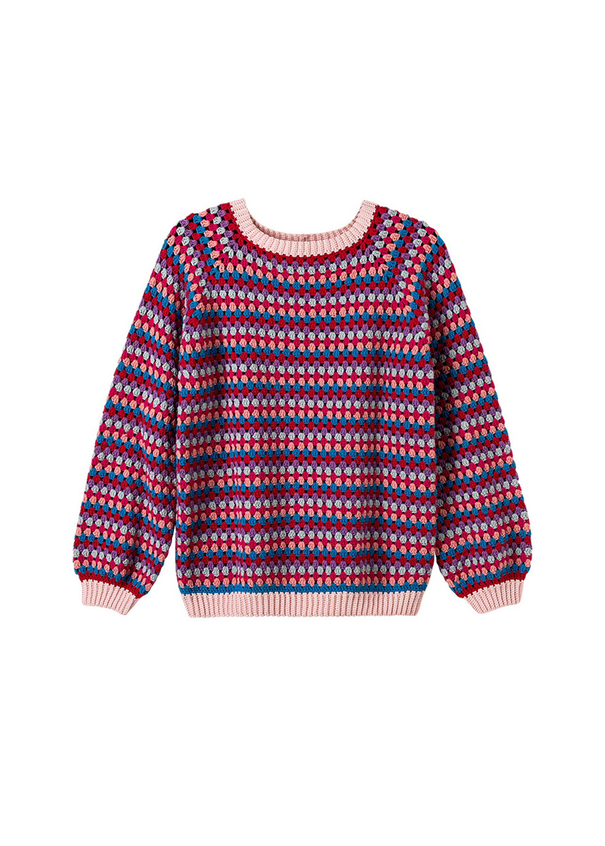 Lana Grossa-kvalitet ”Elastico” (96 % bomuld, 4 % polyester (elité), løbelæng- de = ca. 160 m / 50 gr): ca. 100 gr mørkerød (fv 23), orkidé (fv 191), grågrøn (fv 120), cyklamen (fv 144), laks (fv 132), ensianblå (fv 157) og ca. 50 gr pudder (fv 125), hæklenål nr. 3½.