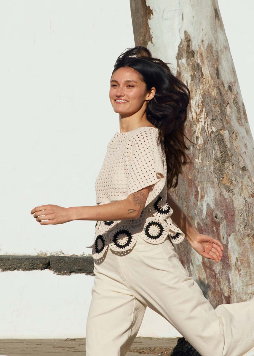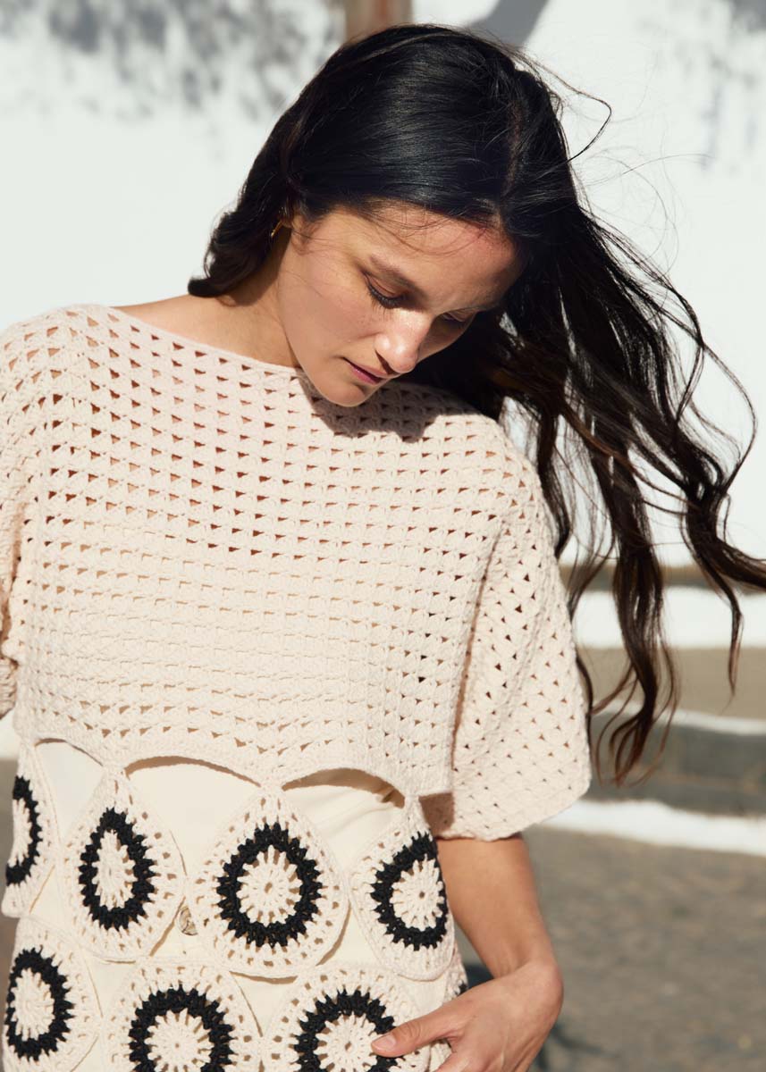 Lana Grossa-kvalitet „Campo” (65 % bomull, 25 % viskose, 10 % lin, løpelengde = ca. 165 m/50 g): ca. 300 g creme (farge 2) og ca. 100 g svart (farge 24); 1 heklenål nr. 3.