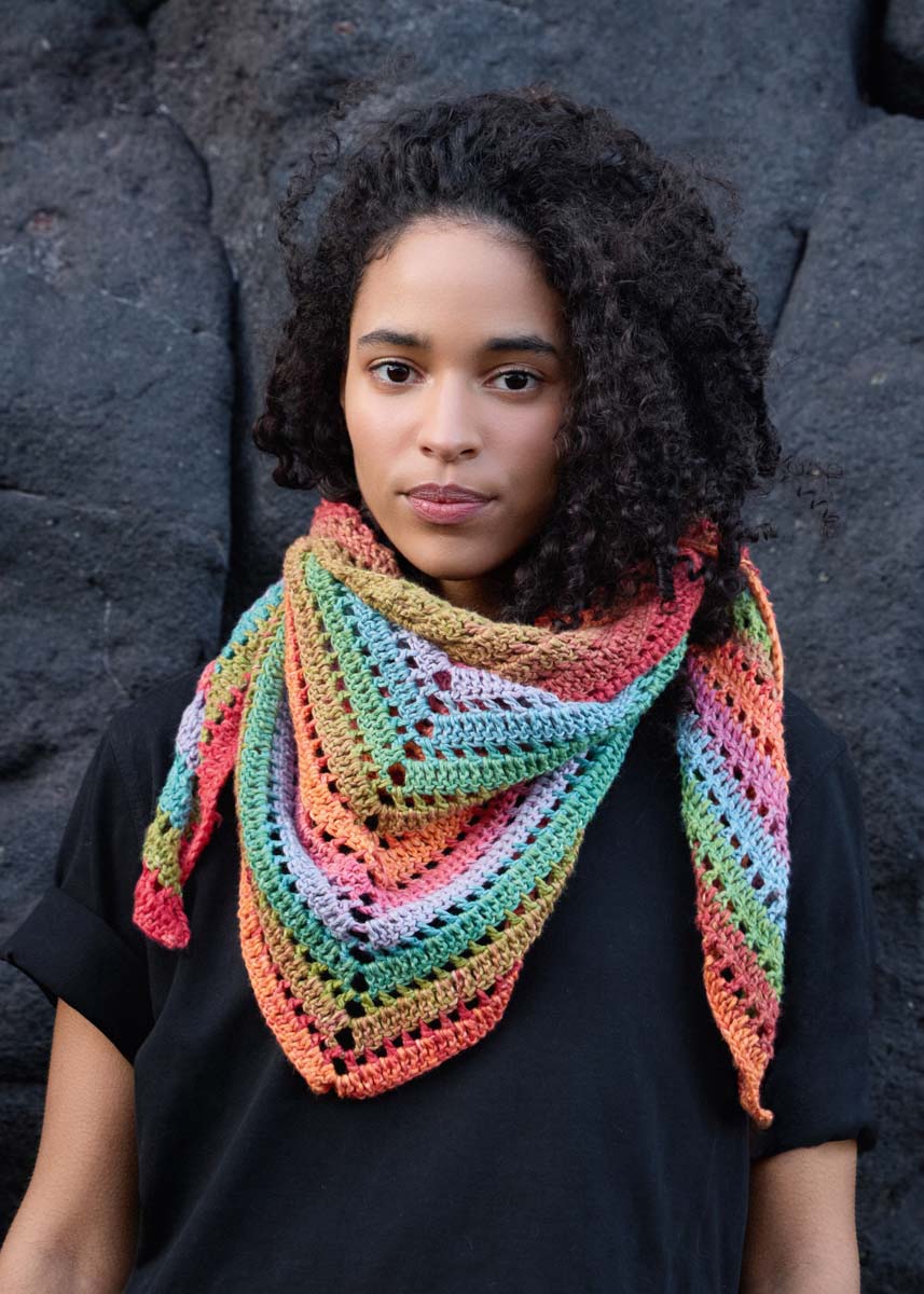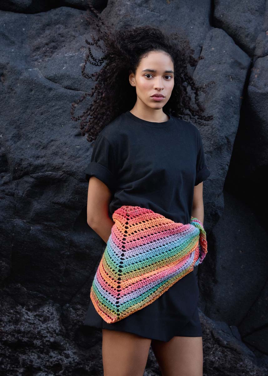 Lana Grossa-kvalitet „Cotonella“ (100 % bomull (Pima), løpelenge = ca 280 m/100 g): ca 2 nøster = ca 200 g syrin/lysblå/tyrkisgrønn/sennep/tomat/bringebær/oransje/laks (farge 11); 1 heklenål nr 6.