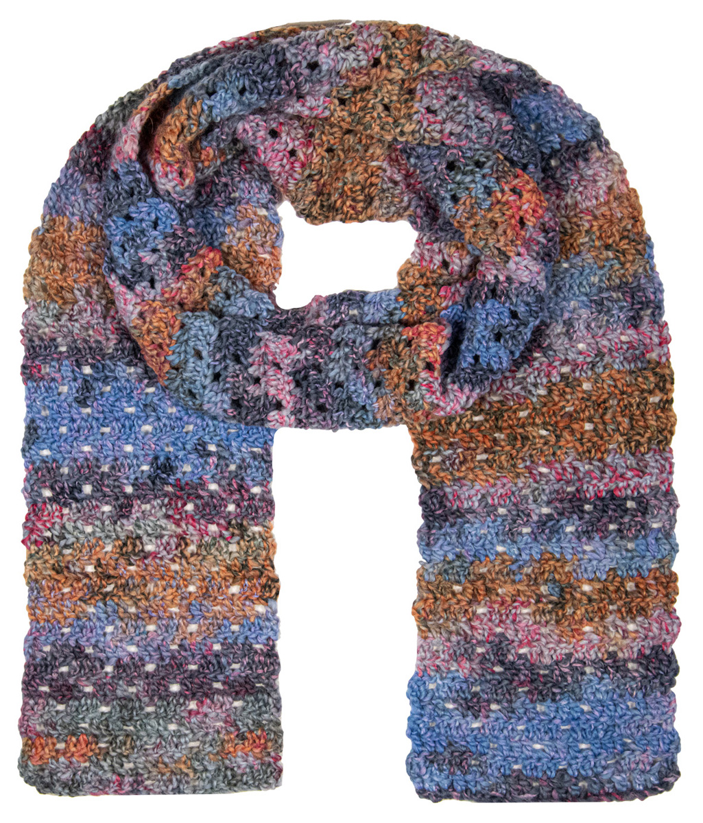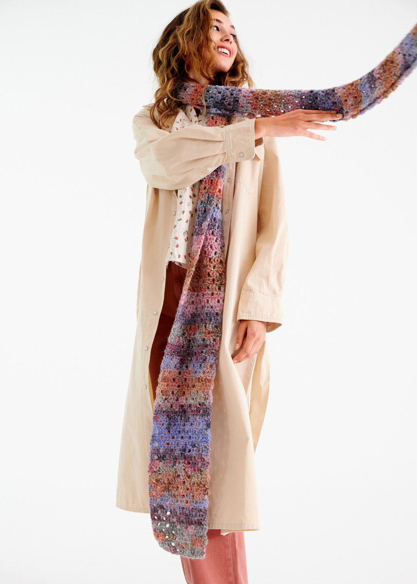Lana Grossa-kvalitet „Lala Berlin Stripy” (56 % ren ny ull (merino), 29 % polyacryl, 14 % (baby) alpacka, 1 % elastan, löplängd = ca. 90 m/50 g): ca. 200 g lax/rosa/ljus grå/mörk grå/syren/ljus blå/violblå (färg 3); 1 ullnål [synål] nr. 8.