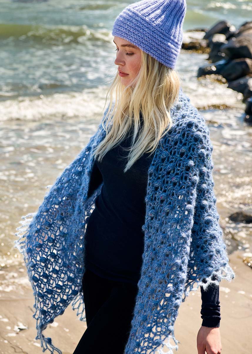Garn: Lana Grossa Natural Superkid Tweed (60 % mohair (superkid), 30 % silke, 7 % bomull, 3 % polyester, LL 200 m/25 g): 125 g lys blå (farge nr. 618) og 100 g mørk blå (farge nr. 619)