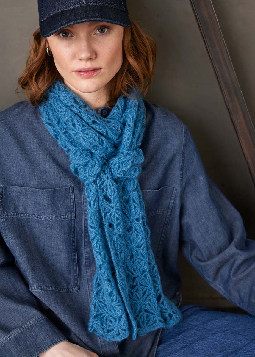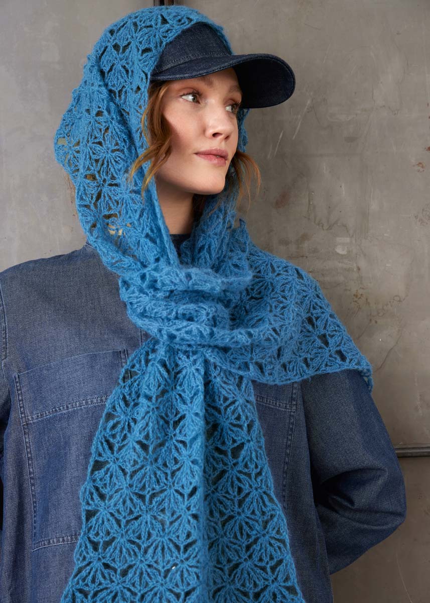 Lana Grossa Colorissimo (100% ren ny ull (merino fin), løpelengde 300 m/100 g), 300 g i orangebrun/sølvgrå/lysgrå/lysbeige/blågrå/stålgrå/mosegrønn/skogsgrønn (farge 215), Lana Grossa Ecopuno (72% bomull, 17% ren ny ull (merino), 11% alpakka (baby), løpelengde 215 m/50 g), 150 g i rust (farge 223) og Lana Grossa Brillino (83 % viskose, 17% metallisk fiber, løpelengde 200 m/25 g), 25 g i nougat/gull (farge 38); 1 heklenål nr. 4.
