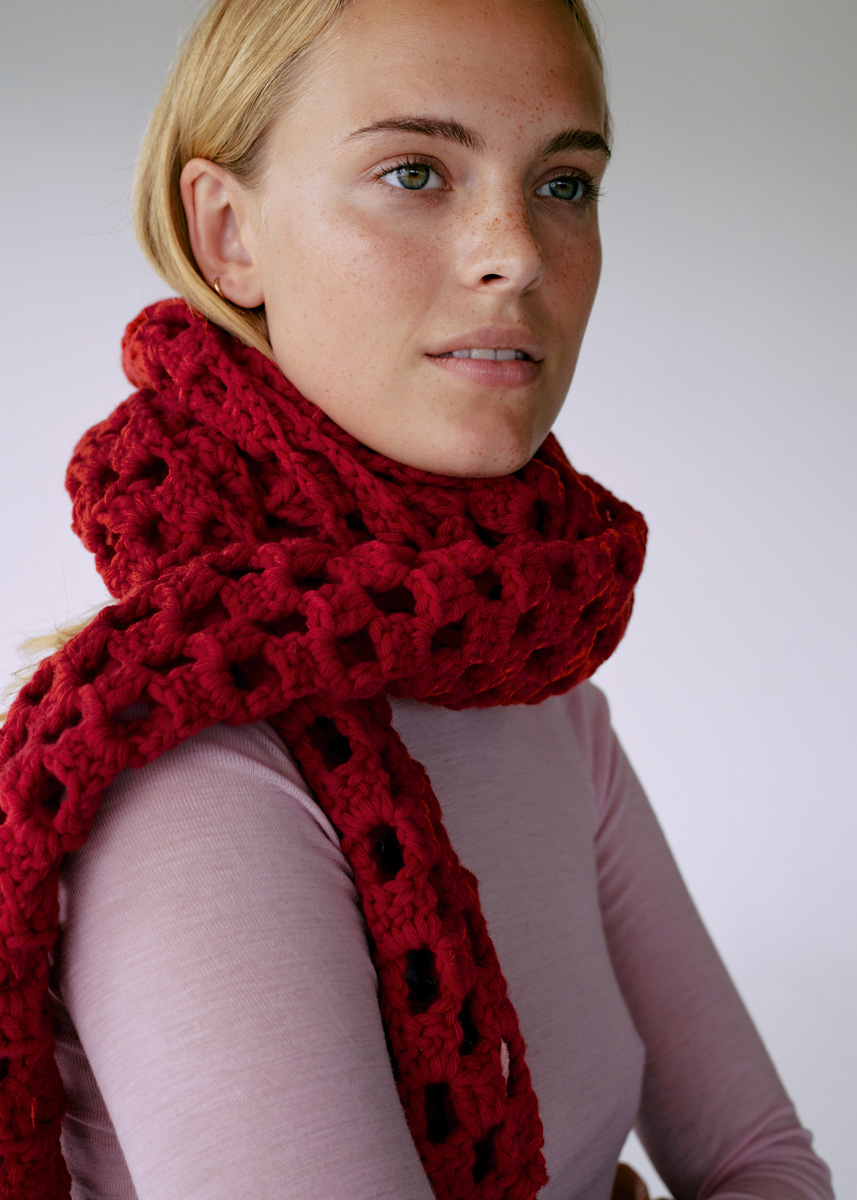 Lana Grossa-kvalitet „Woohoo“ (100 % ren ny ull (merino), löplängd = ca. 250 m/200 g): ca. 400 g mörk röd (färg 5); virknål nr. 7.