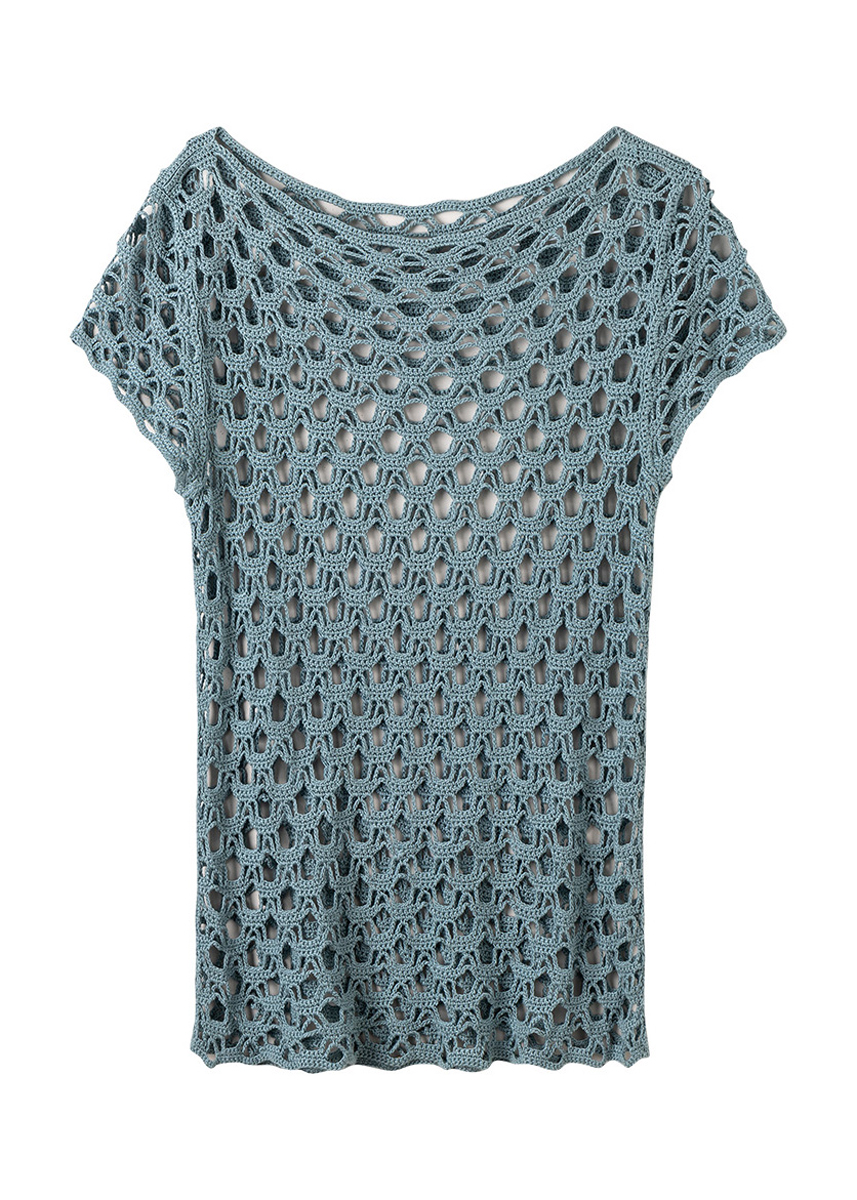 Lana Grossa-kvalitet „Solo Lino” (80 % återv. lin (viskos), 20 % lin, löplängd = ca. 120 m/50 g): ca. 400 (450) g turksgrå (färg 22); 1 virknål nr. 3,5