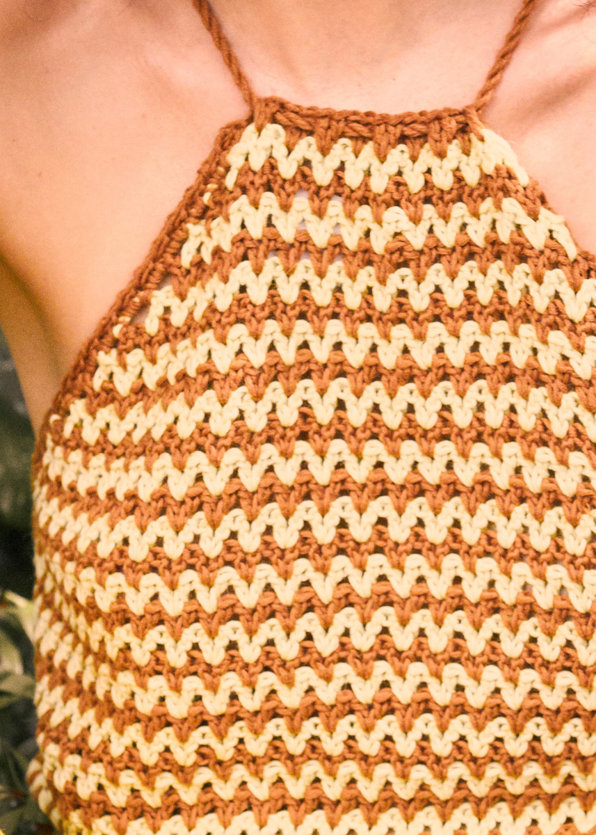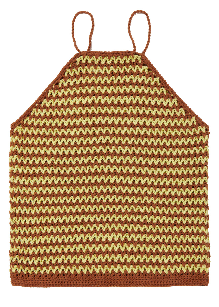 Lana Grossa-kvalitet „Brigitte No. 4“ (80 % bomull, 20 % baby alpacka, löplängd 110 m/50 g): 150 (200/200) g i brun (färg nr. 4) och 100 (150/150) g i gulgrön (färg nr. 30). Virknål 5 (löst virkat) eller 5,5 (hårt virkat) – viktigt är att virkfastheten passar.
