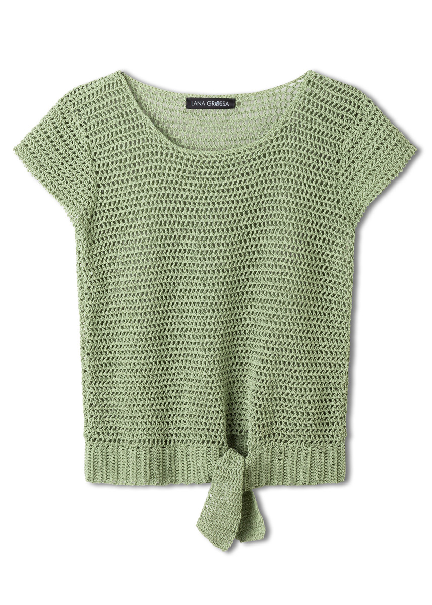 Lana Grossa-kvalitet „Capri” (55 % bomull, 30 % polyamid, 15 % silke , löplängd = ca. 150 m/50 g): ca. 300 (350) g lindgrön (färg 43); 1 virknål nr. 3.