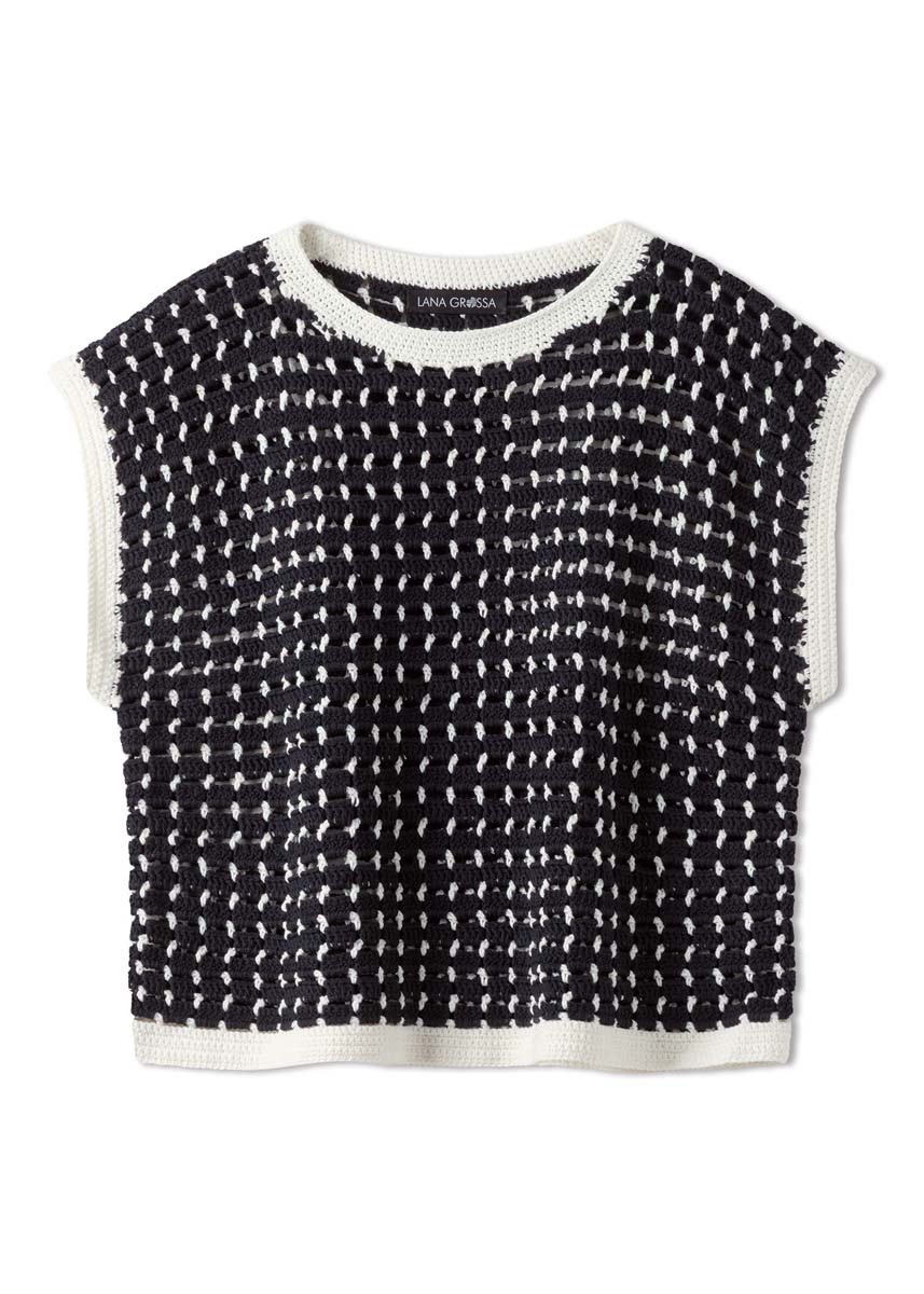 Lana Grossa-kvalitet „Elastico” (96 % bomull, 4 % polyester (Elité), løpelengde = ca. 160 m/50 g): ca. 200 (250) g svart (farge 24) og ca. 150 (200) g ecru (farge 36); heklenål nr. 3 og 3,5