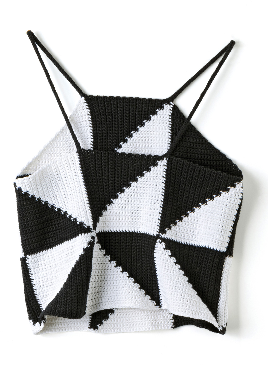 Lana Grossa-kvalitet „Landlust bomull” (100 % (bio) bomull, löplängd = ca. 115 m/50 g): ca. 150 g var i svart (färg 1) och vit (färg 4); 1 virknål nr. 3,5, 2 strumpstickor nr. 3.