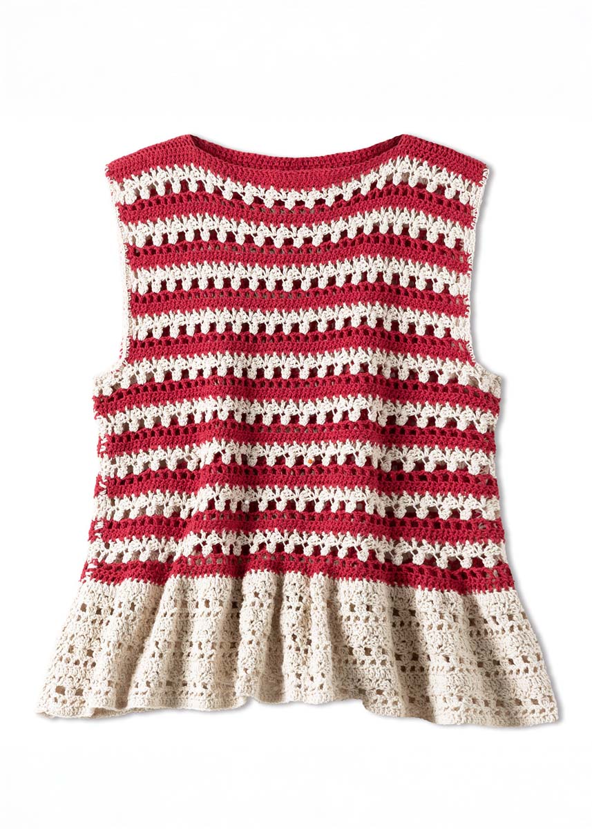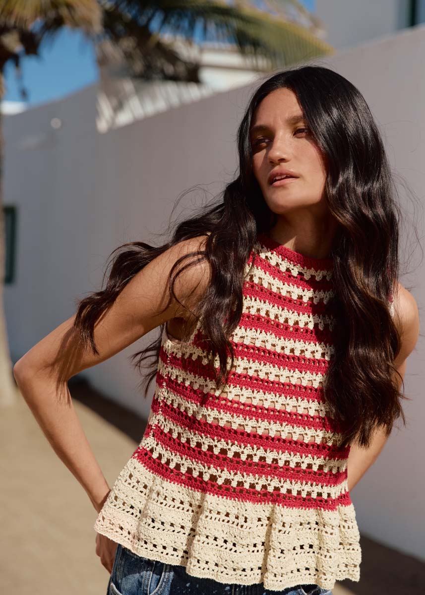 Lana Grossa-kvalitet „Setapura” (100 % silke, løpelengde = ca. 200 m/50 g): ca. 200 (200 – 250) g creme (farge 15) og ca. 100 (100 – 150) g rød (farge 9); 1 heklenål nr. 3,5.
