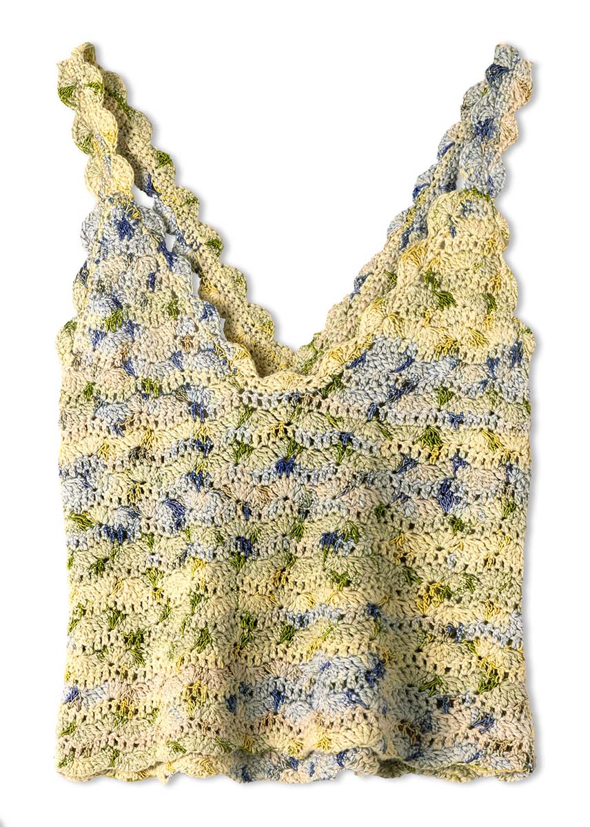 Lana Grossa „Torto“ (90% bomull, 10% polyamid, løpelengde 120 m/50 g), 200 g i vanilje/lys grå/blekgul/pistasj/blå (farge 9); heklenål nr. 3,5.