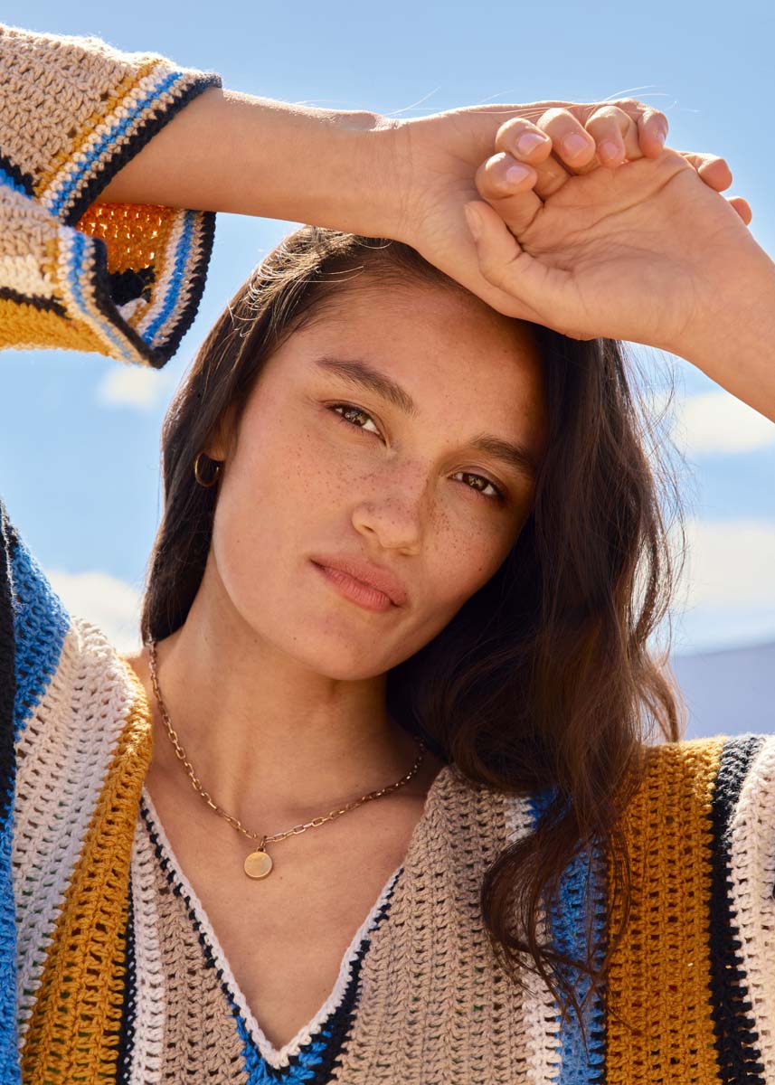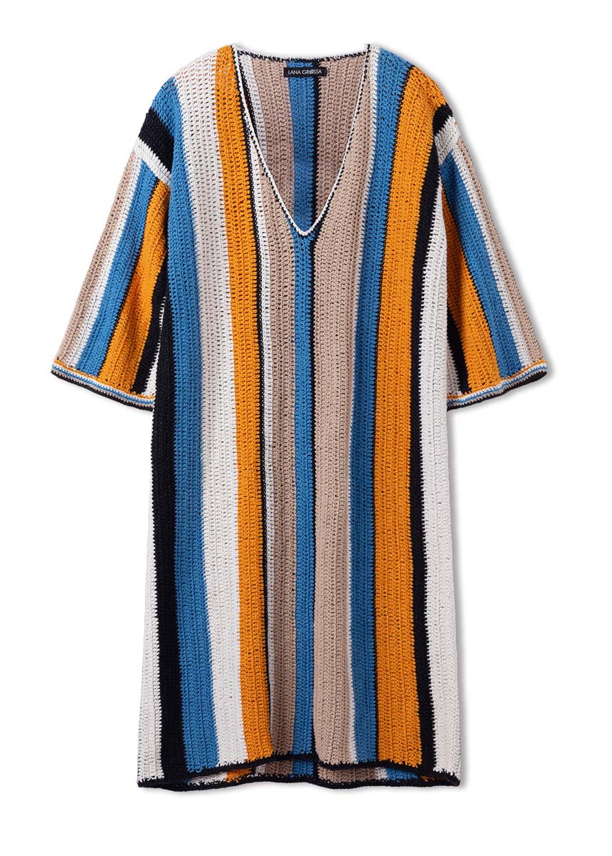 Lana Grossa-kvalitet „Alta Moda Cotolana” (45 % ren ny ull (merino), 45 % (Pima) bomull, 10 % polyamid, løpelengde = ca. 150 m/50 g): ca. 200 (250) g hver i lysebeige (farge 19), kamel (farge 38) og blå (farge 15) og ca. 150 (200) g hver gulorange (farge 60) og svart (farge 17); 1 heklenål nr. 4.