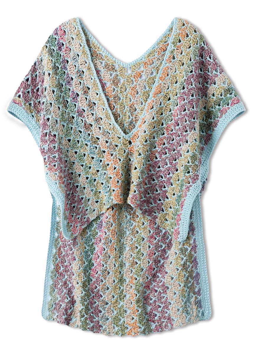 Lana Grossa-kvalitet „Campo” (65 % bomull, 25 % viskose, 10 % lin, løpelengde = ca. 125 m/50 g): ca. 150 (200) g vannblå (farge 33) og Lana Grossa-kvalitet „Mosaico” (54 % bomull, 23 % lin, 23 % viskose, løpelengde = ca. 270 m/100 g): ca. 200 (300) g gråbeige/grå/bjørnebær/fuchsia /petrol/lyseoliv/oransje (farge 6); 1 heklenål nr. 4.