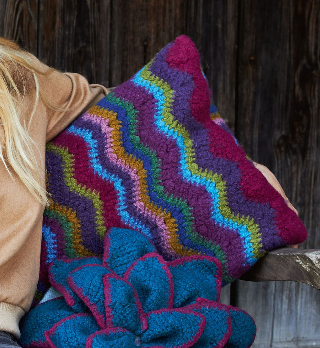 Lana Grossa Qualität „Feltro“ (100 % Schurwolle, LL = 50 m/50 g), 250 g Pflaume (Fb. 54), 200 g Zyklam (Fb. 62), je 100 g Rotviolett (Fb. 22), Türkisblau (Fb. 42), Royal (Fb. 26), Oliv (Fb. 21), Grasgrün (Fb. 11), Messing (Fb. 60), 50 g Erika (Fb. 69); Häkelnadel Nr. 10; Kisseninlett 50 x 60 cm; Allesnäher in passenden Farben; Handnähnadel.