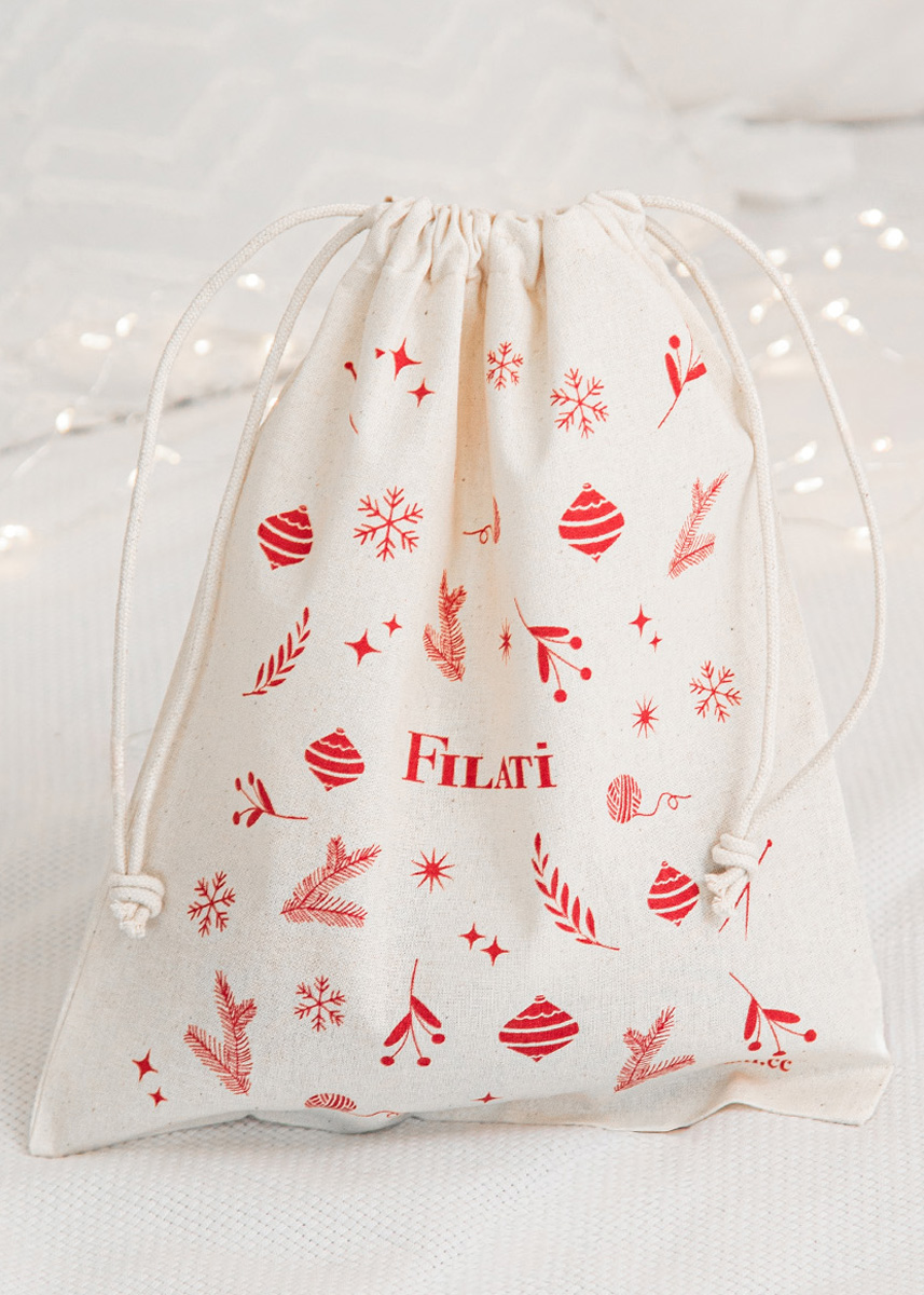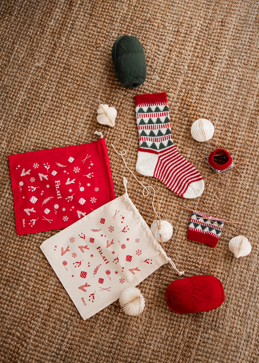 Setet innehåller två dragskopåsar: en i klassiskt julröd med vit tryck och en i naturfärgad bomull med röd design. Den praktiska dragskoöppningen gör dem enkla att öppna och stänga – perfekt för att förvara garn, projekt eller handgjorda gåvor.
