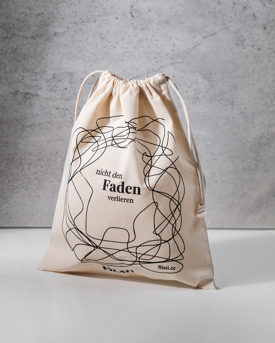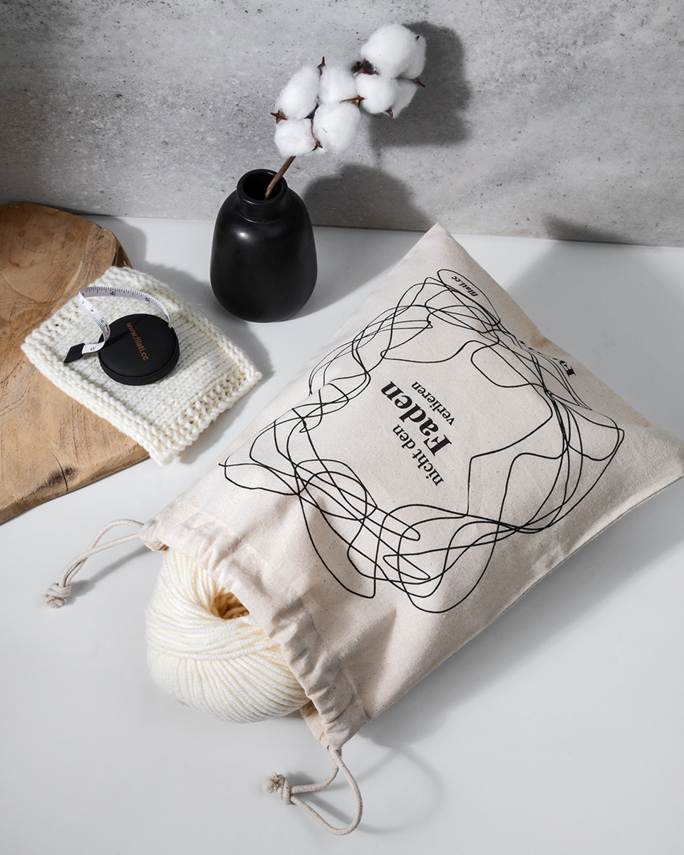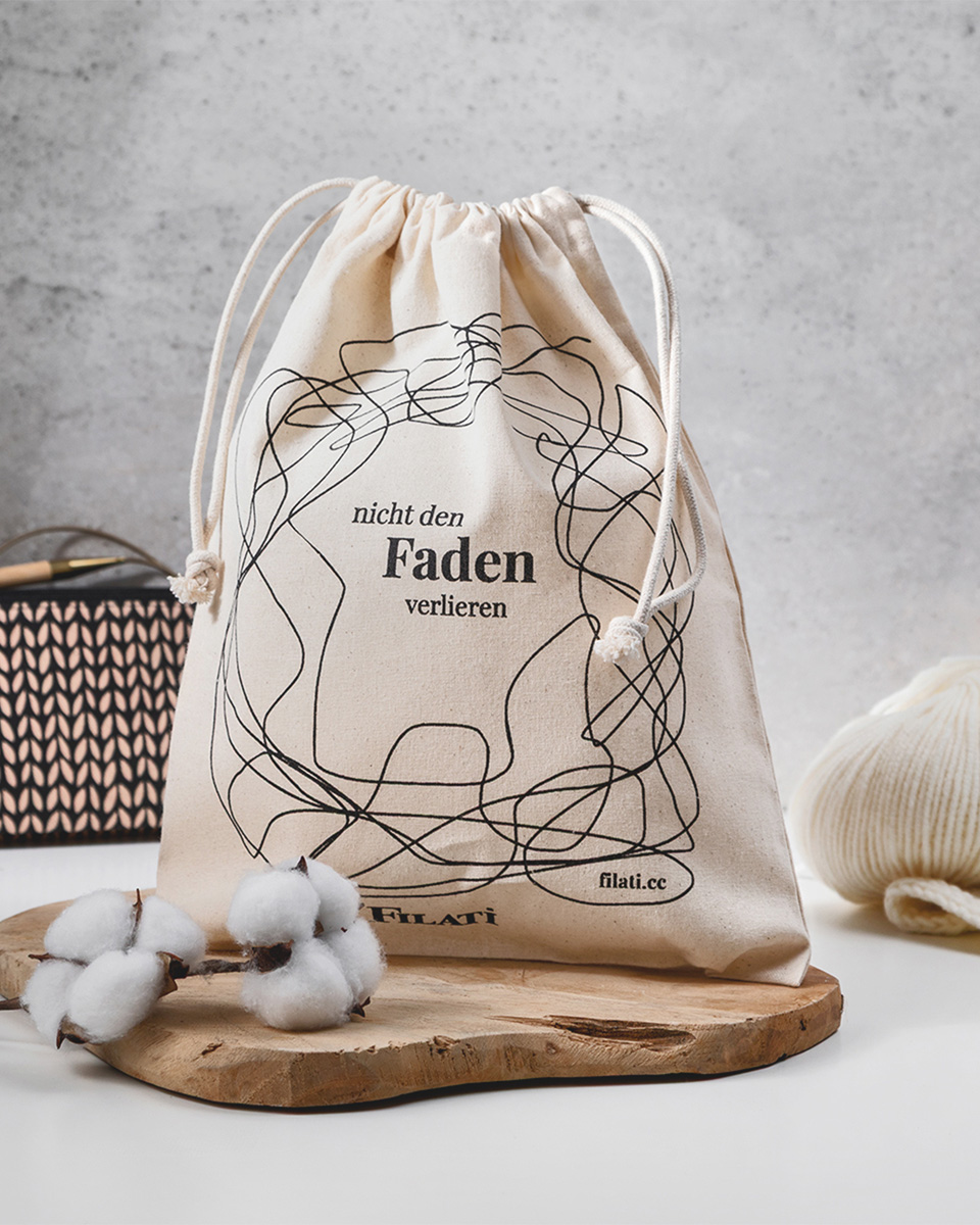 Ditt stickprojekt alltid nära till hands: Denna lätta projektpåse i 100 % certifierad bomull håller ull, stickor och tillbehör samlat och organiserat – perfekt både hemma och på språng. Tack vare den praktiska dragskolukningen kan ditt projekt snabbt packas undan och stängas säkert – bara packa ner och fortsätt sticka när du vill.