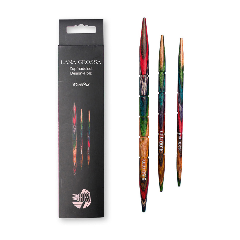 Ett set med tre flätstickor i Design- trä i storlekarna 3,25 mm, 4,0 mm och 5,5 mm.